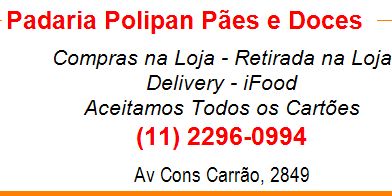 (11) 2296-0994 REDES SOCIAIS www.facebook.com/PadariaPolipan/ www.instagram.com/polipan_padaria/